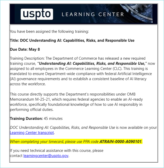 Please be aware that the admins have stated that the 'Understanding AI: Capabilities, Risks, and Responsible Use' training wasn't assigned to contractors and isn't available to them either, due to the limited licenses for contractors to access NOAA.